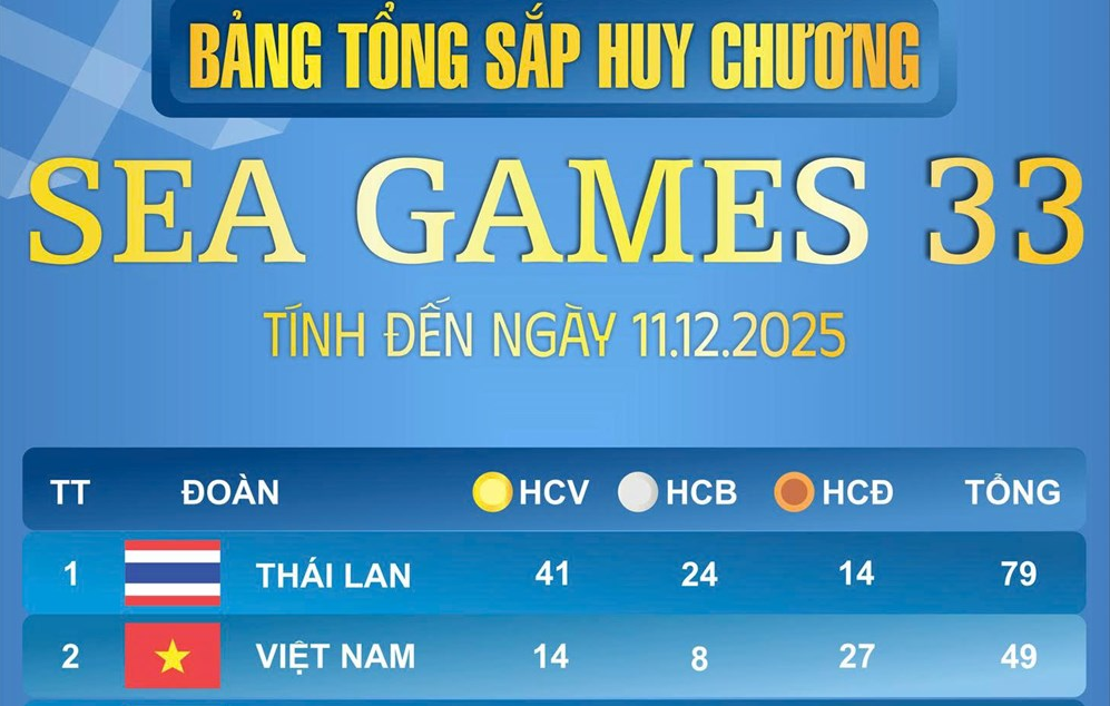 Trong ngày 11.12, nước chủ nhà Thái Lan tiếp tục khẳng định ưu thế khi giành thêm 22 HCV, duy trì ngôi đầu một cách thuyết phục. Tính đến 23h, Thái Lan đã có tổng cộng 79 huy chương, gồm 41 HCV, 24 HCB và 14 HCĐ, cho thấy sự bứt phá mạnh mẽ ngay từ giai đoạn đầu của Đại hội.