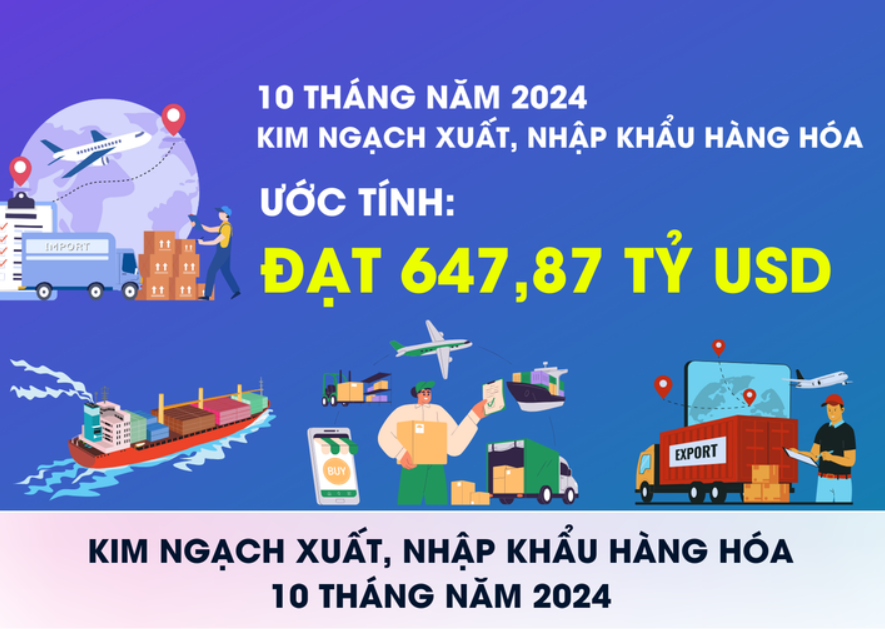10 tháng năm 2024, tổng kim ngạch xuất, nhập khẩu hàng hóa đạt 647,87 tỷ USD