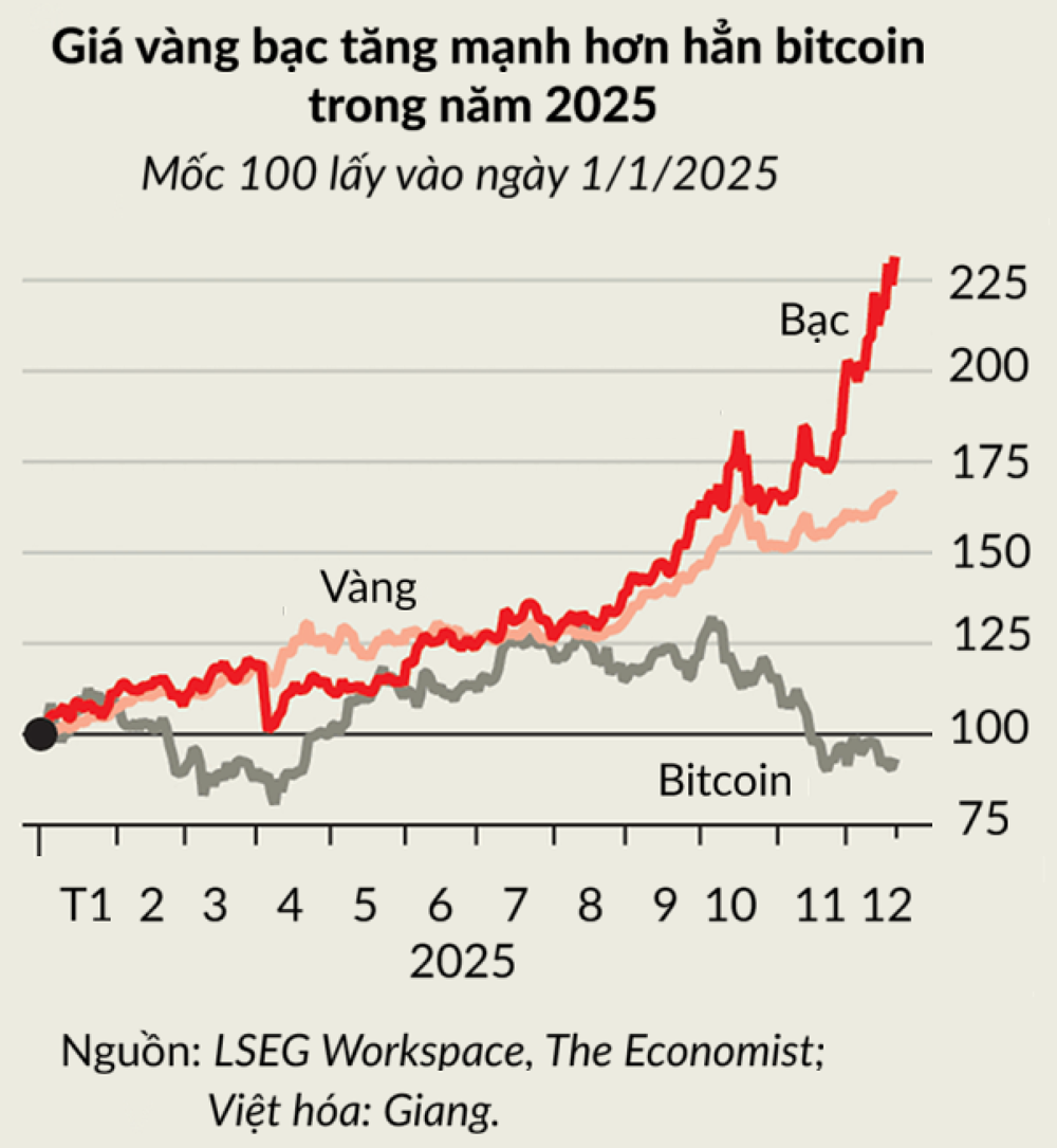 Khi giá vàng tăng lên mức quá cao, nhà đầu tư lại chuyển hướng sang kim loại quý khác là bạc, thay vì đổ tiền vào bitcoin. Trong năm nay, giá bạc thậm chí còn diễn biến vượt trội hơn vàng, với mức tăng hơn 140%.