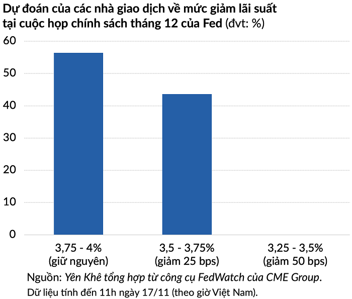 Theo CME Group, các nhà giao dịch trên thị trường tương lai dự đoán có 56,1% khả năng Fed sẽ giữ nguyên lãi suất tại cuộc họp cuối năm. Đây là sự thay đổi đáng chú ý, bởi chỉ một tháng trước, thị trường gần như tin chắc Fed sẽ hạ lãi suất 25 điểm cơ bản (bps).