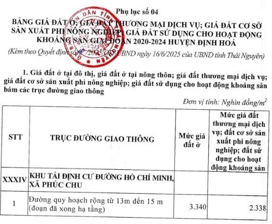 Xã Định Hóa đưa ra thị trường mức giá là 3,34 đồng/m2 tọa lạc tại khu tái định cư đường Hồ Chí Minh. Với đặc điểm là đường quy hoạch rộng từ 13m đến 15m (đoạn đã xong hạ tầng).
