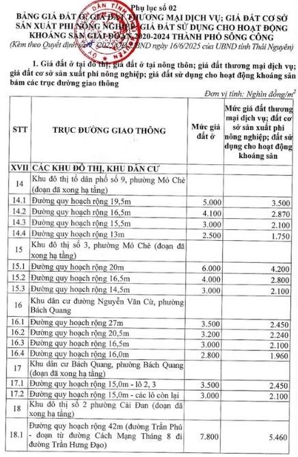 Tại bảng giá đất này, phường Phan Đình Phùng ghi nhận mức giá cao nhất, dao động trong khoảng từ 1,15-8 triệu đồng/m2. Mức giá thấp nhất nằm tại khu trung tâm hành chính, tái định cư xã Phúc Hà (cũ - nay là phường Quyết Thắng) với đường quy hoạch rộng 12m và 11,5m.