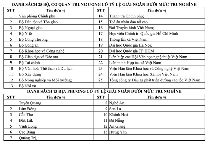Tuy nhiên, vẫn còn 25 bộ, cơ quan trung ương và 13 địa phương có tỷ lệ giải ngân đạt dưới mức bình quân chung cả nước.