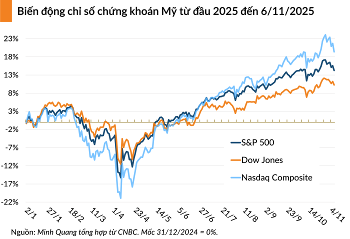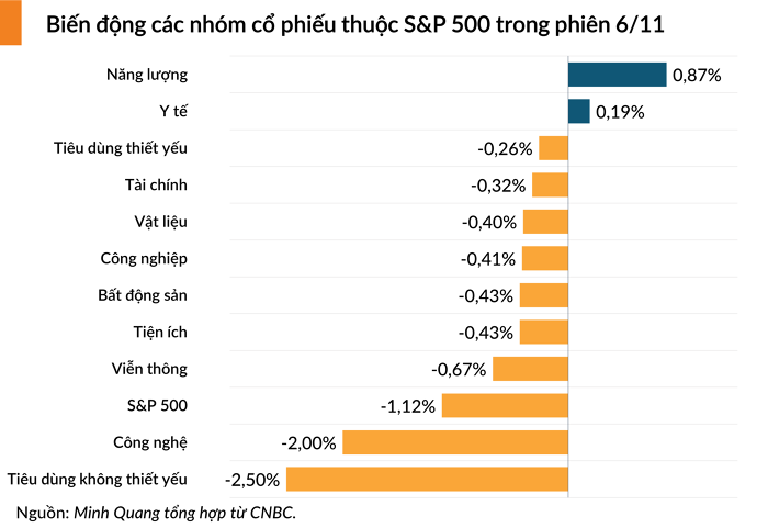 Theo CNBC, trong phiên giao dịch ngày 6/11, chỉ số trung bình công nghiệp Dow Jones đã giảm 399 điểm, tương đương 0,84%, xuống 46.912 điểm. Chỉ số S&P 500 mất 1,12%, chốt phiên với 6.720 điểm. Chỉ số thiên về công nghệ Nasdaq Composite tụt 1,9% xuống 23.054 điểm.