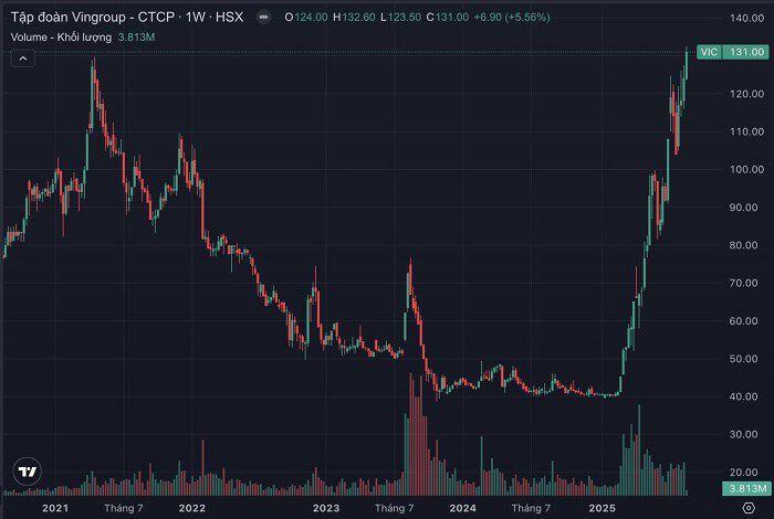 Kết phiên 25/8, VIC tăng 5,6% lên 131.000 đồng/cp, có lúc đạt 132.600 đồng/cp trong phiên. Đây là mức giá cao hơn đỉnh 128.000 đồng từng lập năm 2021 (đã điều chỉnh). Với gần 3,9 tỷ cổ phiếu lưu hành, vốn hóa Vingroup vượt 508.000 tỷ đồng (gần 20 tỷ USD), cao nhất lịch sử và chỉ xếp sau Vietcombank – hơn 531.000 tỷ đồng.
