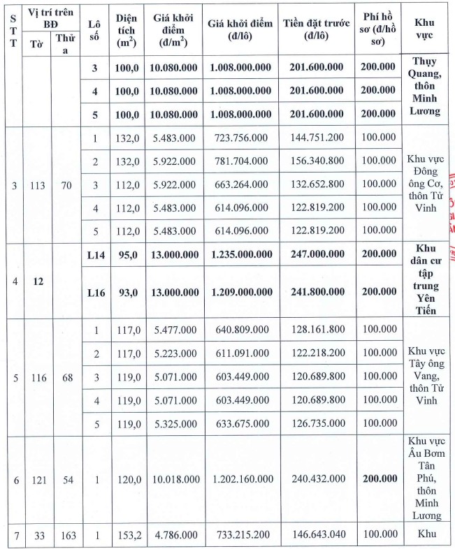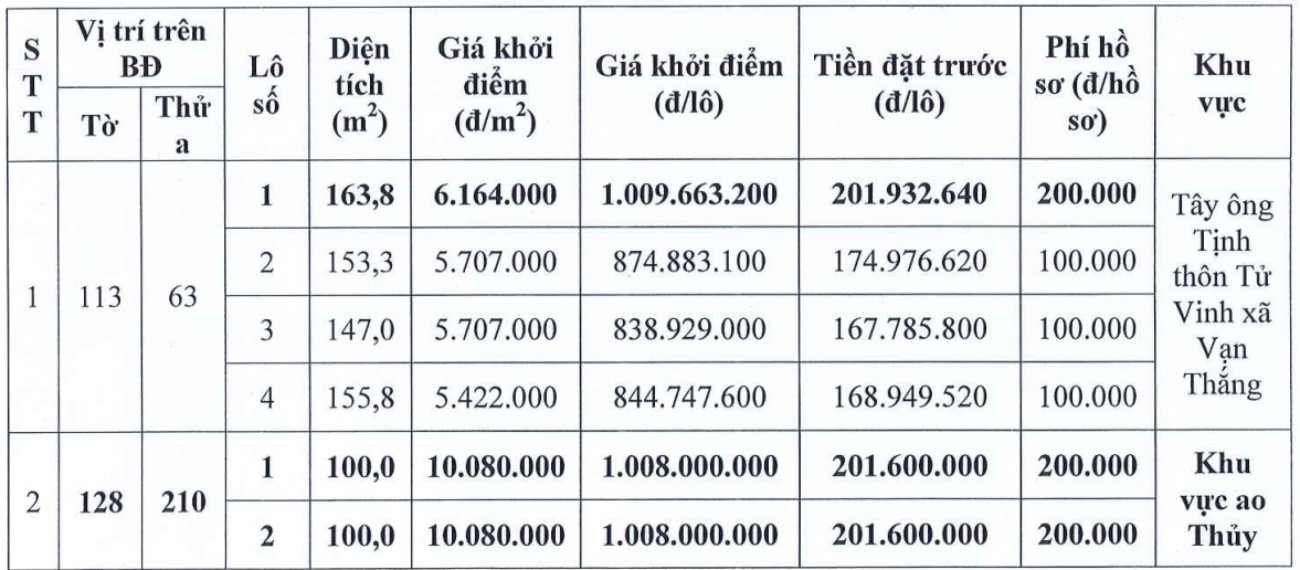 Tổng diện tích đấu giá là 3.243m2, với các lô có diện tích từ 93 - 163,8m2. Giá khởi điểm dao động từ 4,3 - 13 triệu đồng/m2, tương đương 603 triệu đồng đến hơn 1,2 tỉ đồng/lô. Tổng giá khởi điểm toàn bộ các lô đất là 21,56 tỉ đồng.