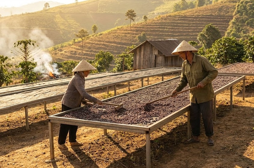 Nông dân Tây Nguyên phơi cà phê trong nắng sớm. Hình minh họa