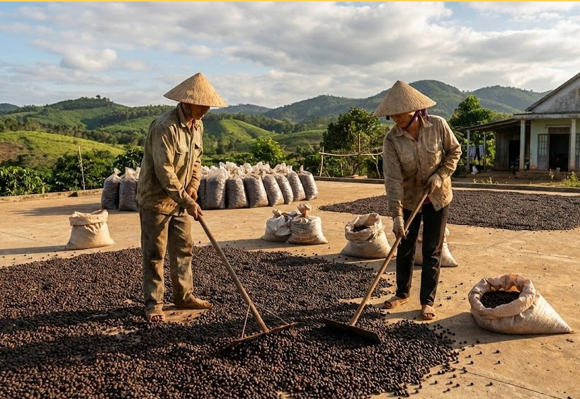 Nông dân Đắk Nông đang phơi mẻ cà phê cuối vụ. Tâm lý giữ hàng chờ giá cao dịp cận Tết 2026 giúp thị trường nội địa đứng vững trước đà giảm của thế giới - Ảnh minh họa