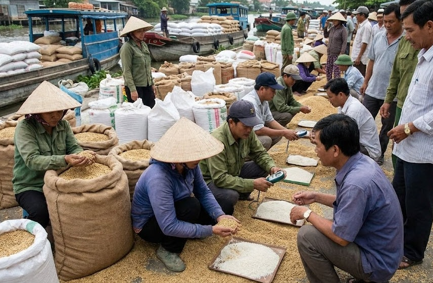 Gạo nguyên liệu và lúa tươi được sàn thương lái kiểm tra trước khi bán ra thị trường - Ảnh minh họa