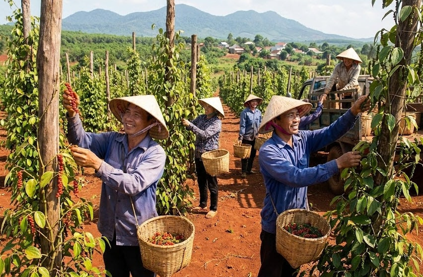 Nông dân thu hoạch hồ tiêu tại vùng chuyên canh. Hình minh họa