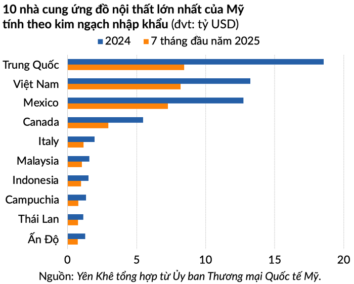 Theo dữ liệu từ Ủy ban Thương mại Quốc tế Mỹ, vào năm 2024, Mỹ đã nhập khẩu lần lượt 18,5 tỷ USD sản phẩm nội thất từ Trung Quốc, 13,2 tỷ USD từ Việt Nam và 12,7 tỷ USD từ Mexico.