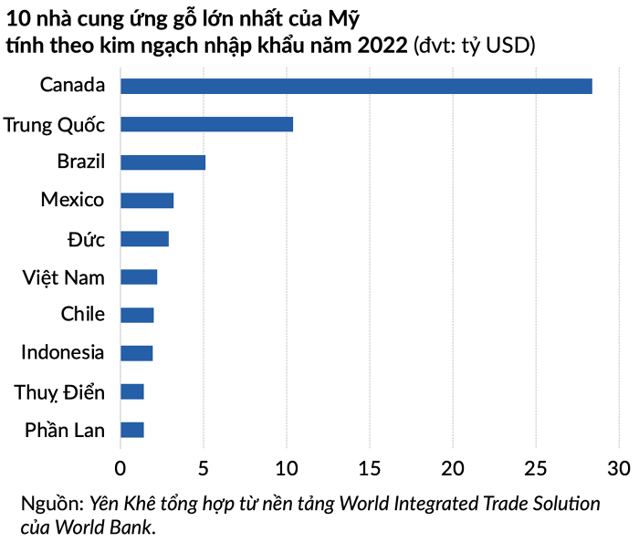 Theo đó, kim ngạch xuất khẩu gỗ từ Canada sang Mỹ đạt khoảng 28,4 tỷ USD. Trung Quốc, Brazil, Mexico và Đức theo sau với kim ngạch xuất khẩu sang Mỹ lần lượt đạt 10,4 tỷ USD, 5,1 tỷ USD, 3,2 tỷ USD và 2,9 tỷ USD.