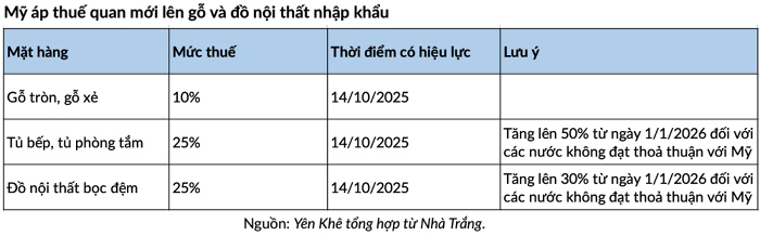 Các mức thuế quan mới của Mỹ đối với sản phẩm gỗ và đồ nội thất nhập khẩu sẽ có hiệu lực từ ngày 14/10.