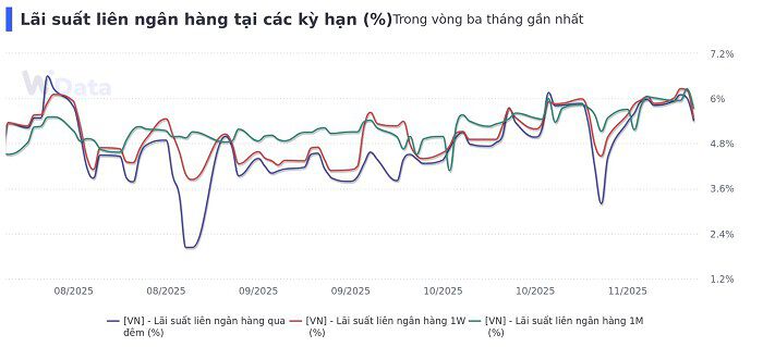 Trong tuần, lãi suất qua đêm tiếp tục neo cao, bắt đầu từ mốc 5,93% vào đầu tuần và tăng dần lên mốc 6,1% tại phiên 11/11, trước khi giảm dần về 5,4% tại ngày 13/11.