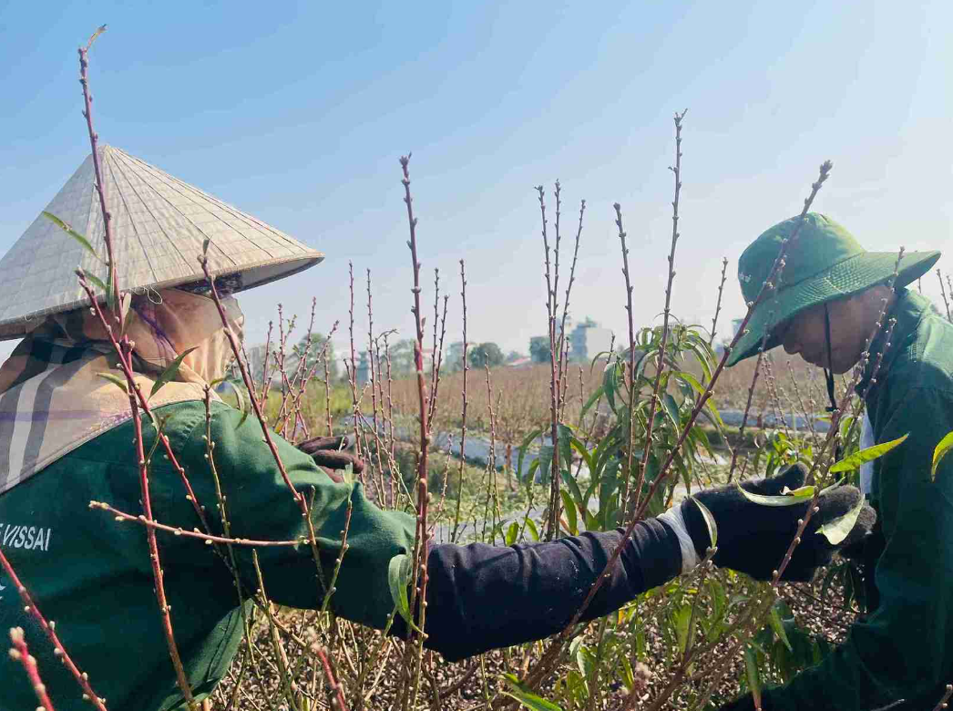 Ông Nguyễn Văn Xá chia sẻ: “Tuốt lá là công đoạn quan trọng nhất của cả vụ đào. Tuốt sớm quá thì đào nở trước Tết, còn muộn quá thì hoa không kịp bung. Chỉ cần lệch vài ngày là ảnh hưởng ngay đến chất lượng hoa”.
